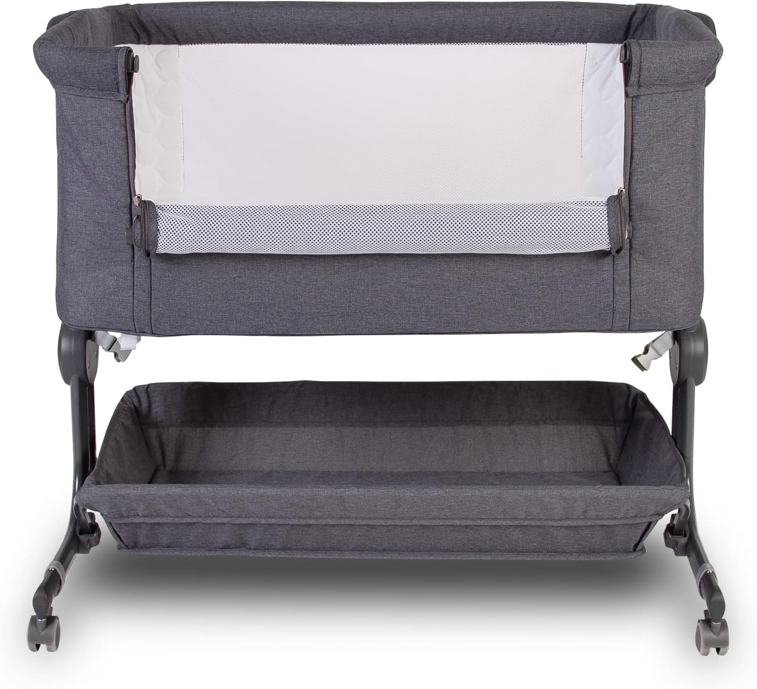 Designed for co-sleeping with drop-side access.Multiple height settings for bed alignment.